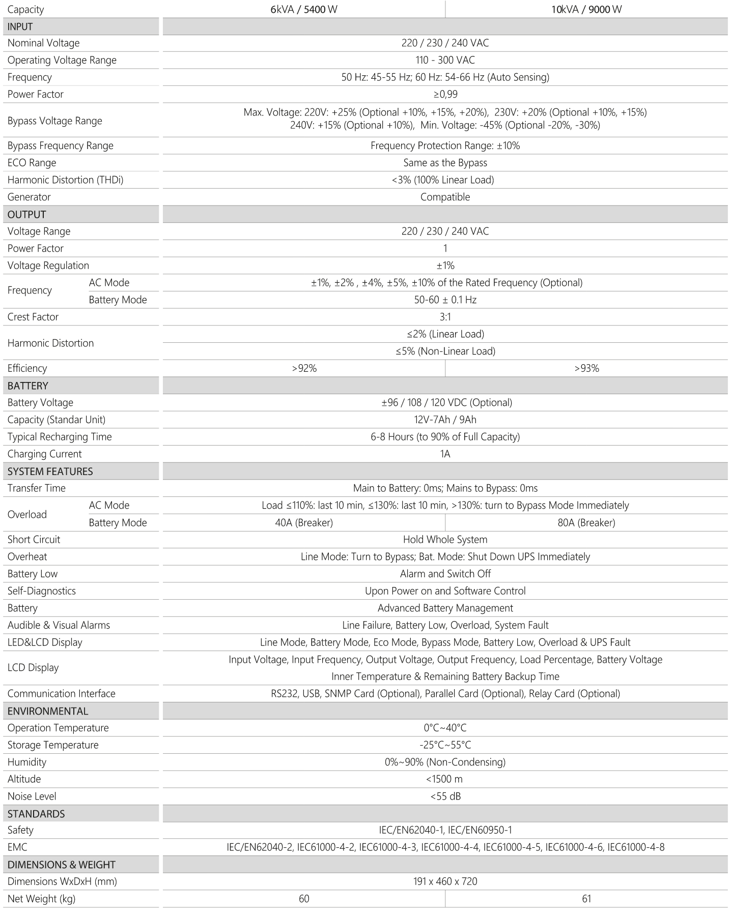 True Double-Conversion Online Technology True Sine-wave Output provides clean energy High Reliability with Microprocessor Control 0,9 Output Power Factor Wide Input Voltage Range (110~300V)