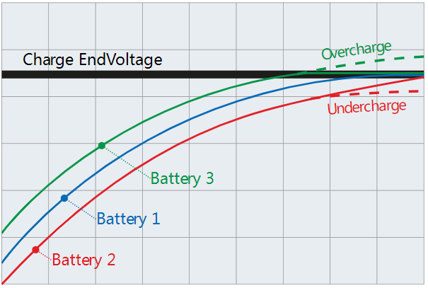 The charging of Battery 3 is capped to prevent overcharging and gassing. Supply of charging energy to Battery 2 is continued and boosted until the target charging voltage is obtained. Battery 1 performs ideally and is not regulated.