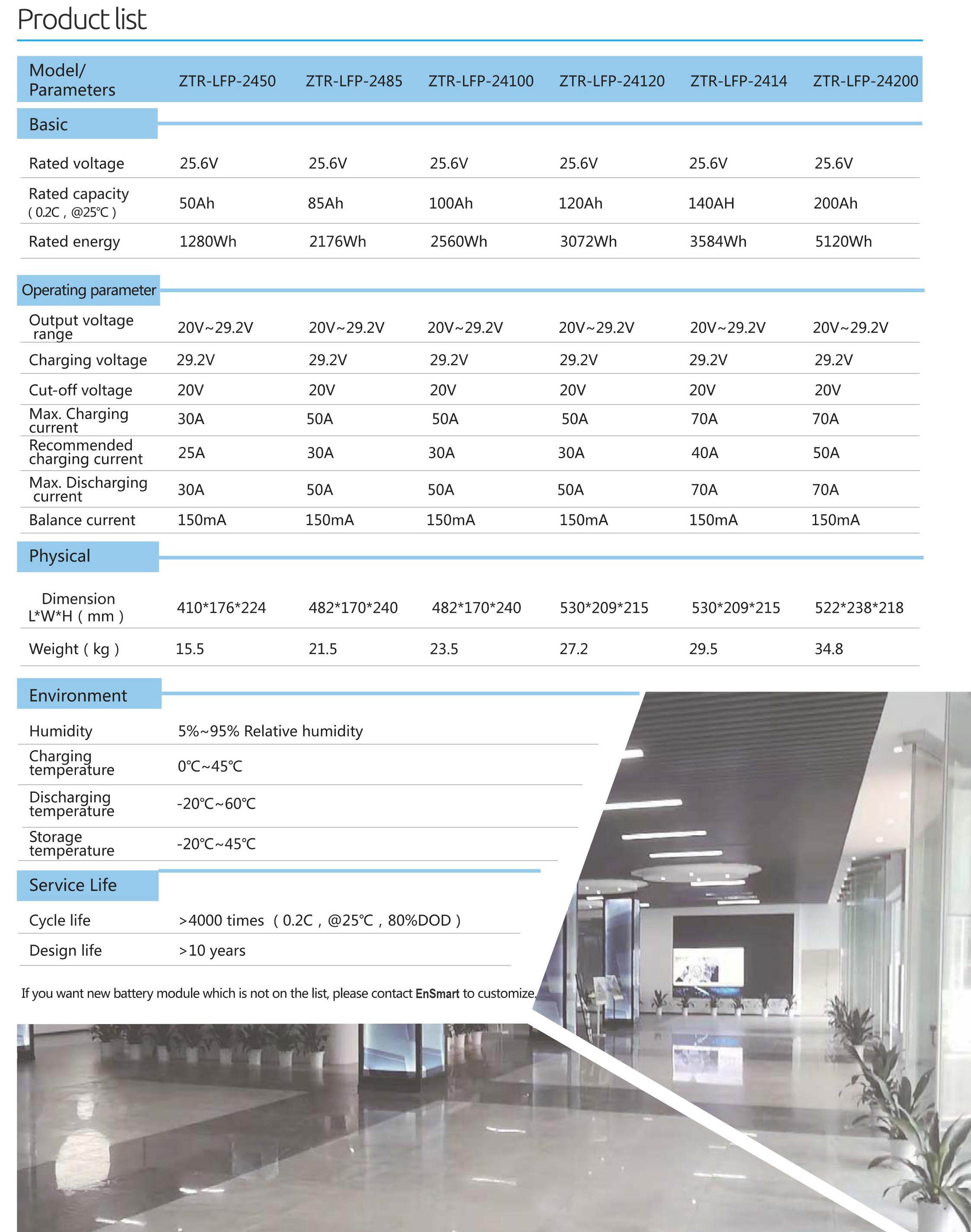 ZTR-LFP-24 series is Lithium iron phosphate battery module which designed for UPS, solar system, portable devices, energy storage and medical cart applications. This battery module integrated with intelligent BMS inside, has big advantages on safety, cycle life, energy density, temperature range and environmental protection. To provide customers with safe and stable one-stop power supply services.