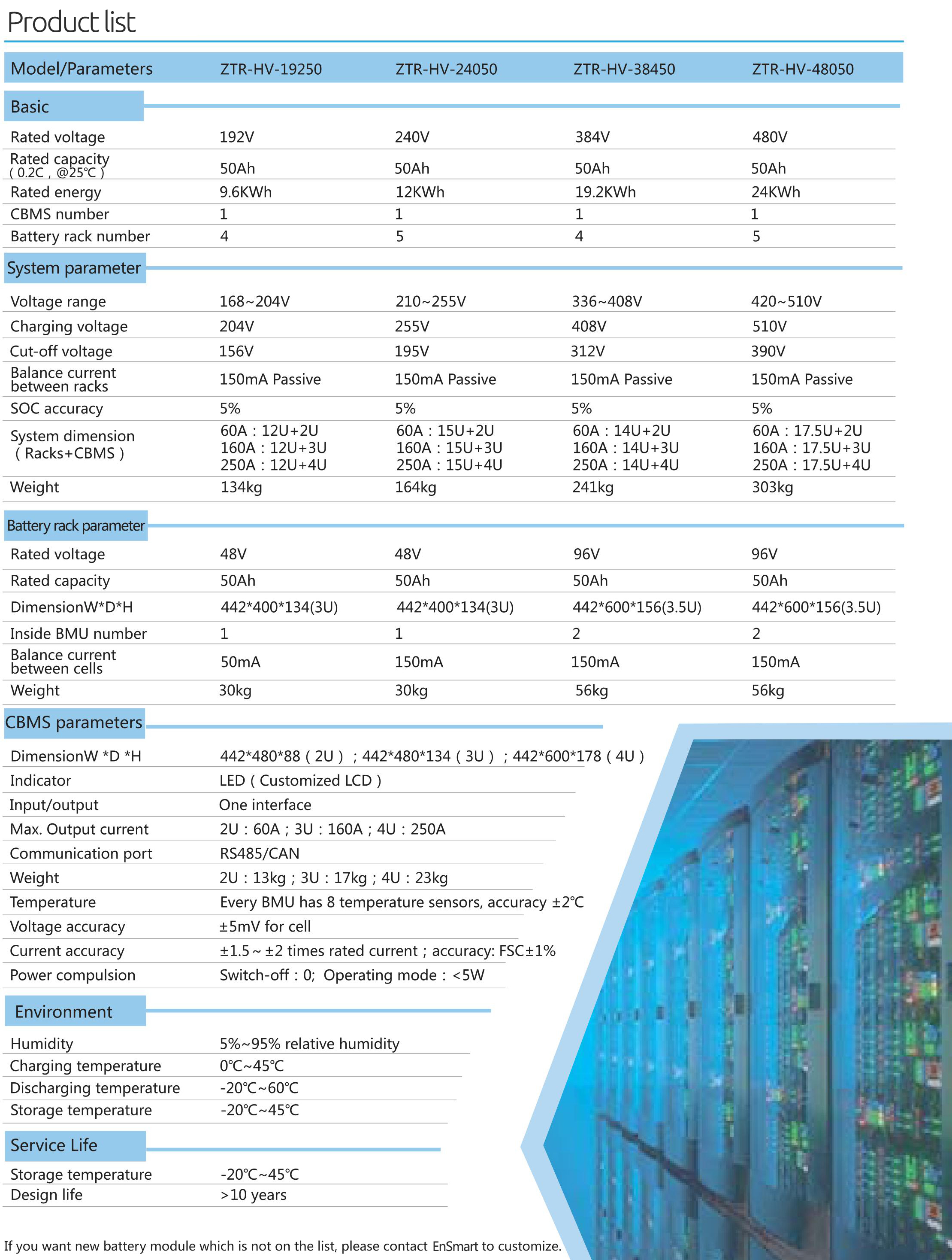 ZTR-HV series is Lithium iron phosphate battery system which designed for high voltage UPS system application, suitable for 100V to 800V UPS system which backup time is over lOmin. This battery system consists of battery racks and CBMS, every battery rack integrates with intelligent BMU inside. And this system has big advantages on safety, cycle life, energy density, fast charging, temperature range and environmental protection. Ensmart is committed to providing safe and stable power supply for UPS system.